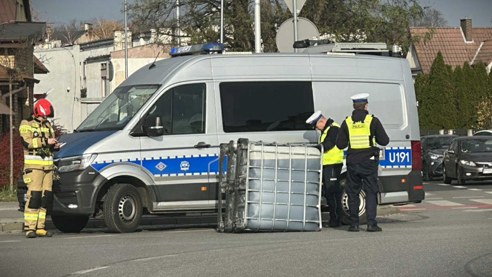 W piątek, 14 listopada około godziny 11.30 z auta ciężarowego, które poruszało się po rondzie Ptolemeusza w Kaliszu, u zbiegu Szlaku Bursztynowego, ul. Częstochowskiej i Nowego Światu, wypadł wypełniony cieczą zbiornik typu mauzer. Jak ustalono, kierowca nie zorientował się, że zgubił przewożony ładunek i odjechał z miejsca.