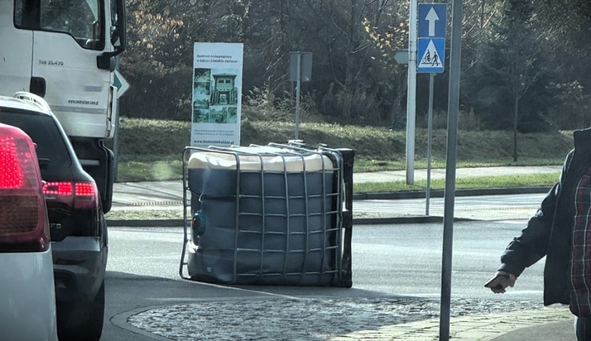 W piątek, 14 listopada około godziny 11.30 z auta ciężarowego, które poruszało się po rondzie Ptolemeusza w Kaliszu, u zbiegu Szlaku Bursztynowego, ul. Częstochowskiej i Nowego Światu, wypadł wypełniony cieczą zbiornik typu mauzer. Jak ustalono, kierowca nie zorientował się, że zgubił przewożony ładunek i odjechał z miejsca.