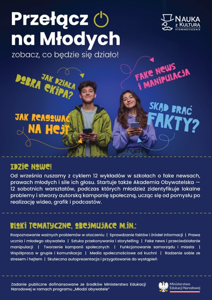 „Przełącz na Młodych” realizowane jest przez Stowarzyszenie Nauka z Kulturą dzięki dofinansowaniu Ministerstwa Edukacji Narodowej w ramach programu Młodzi Obywatele.