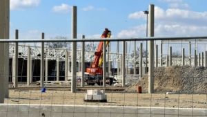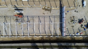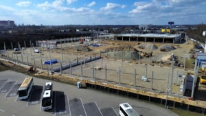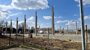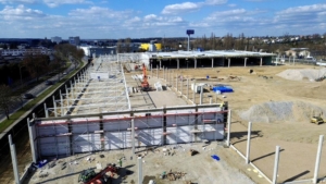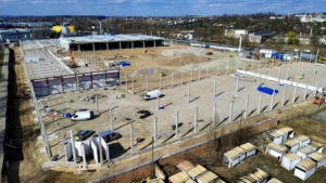 Najbardziej charakterystycznym elementem obecnego etapu są rzędy wysokich żelbetowych kolumn, które z daleka wyznaczają kształt przyszłej galerii. Filarowa konstrukcja ustawiona została w układzie przypominającym literę „L” i stanowi podstawę pod docelową bryłę obiektu. To właśnie na niej powstanie nowoczesny park handlowy.