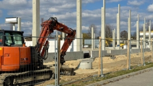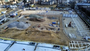 Jeszcze kilka miesięcy temu na działce trwały intensywne prace rozbiórkowe. Stary obiekt Tesco był stopniowo demontowany, a teren przygotowywany pod nową inwestycję. Dziś ten etap jest już praktycznie zakończony. Inwestor – spółka Europrojekt Alfa Saller Polbau – przystąpił do realizacji konstrukcji nowego obiektu handlowego.