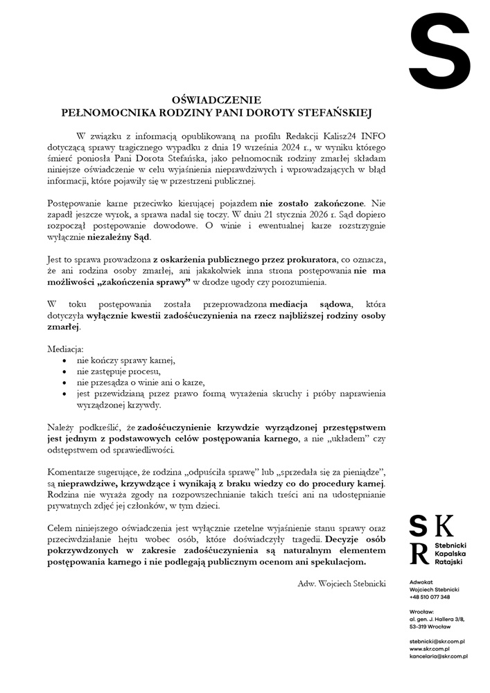 Oświadczenie pełnomocnika rodziny Pani Doroty Stefańskiej