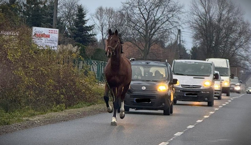 Takiego widoku kierowcy przejeżdżający przez Stobno w gminie Godziesze Wielkie na pewno się nie spodziewali. W piątkowy poranek drogą przez miejscowość… galopował piękny koń, który postanowił wybrać się na samotną przejażdżkę, wyraźnie niezależną od jakichkolwiek jeźdźców.