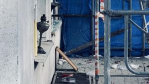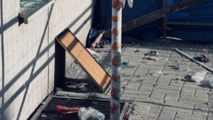Sprawcy wybili szyby w oknach pod siatką ustawionego pod blokiem rusztowania. Na zewnątrz znajdowało się kilka zniszczonych i rozrzuconych przedmiotów pochodzących ze środka.