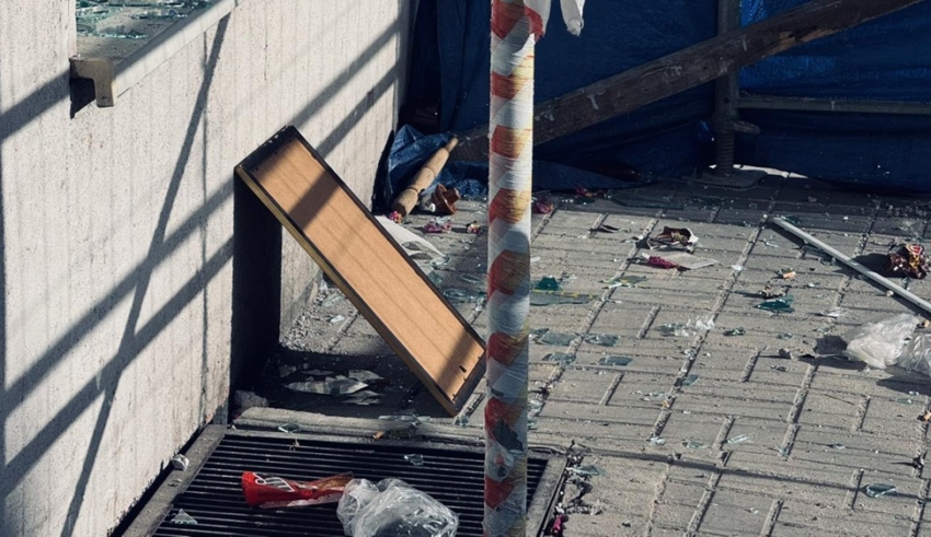 Sprawcy wybili szyby w oknach pod siatką ustawionego pod blokiem rusztowania. Na zewnątrz znajdowało się kilka zniszczonych i rozrzuconych przedmiotów pochodzących ze środka.