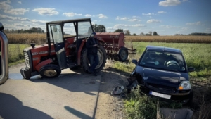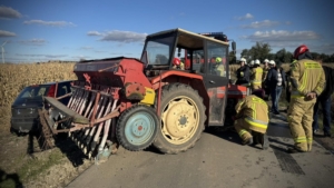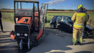 Zablokowana jest droga Kosmów – Kosmów-Kolonia w gm. Ceków. To po zderzeniu auta osobowego z ciągnikiem rolniczym. Na miejscu pracuje straż pożarna i policja. Na szczęście nikomu nic się nie stało.